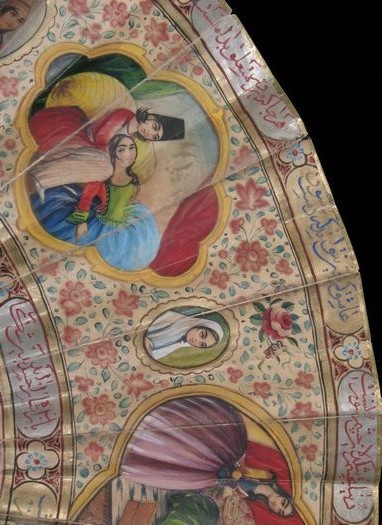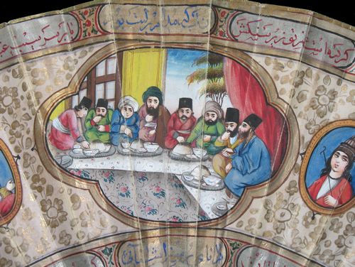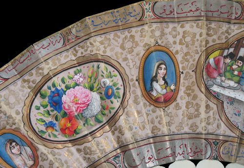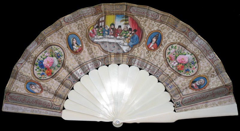 Les éventails mêlant ainsi la cultures persane et européenne sont manifestement très rares. Un autre exemple, avec la culture chinoise en sus, se trouve au MET de New-York.